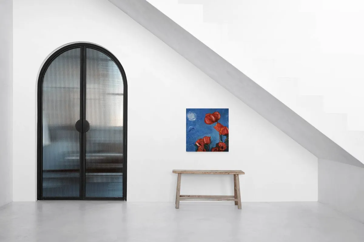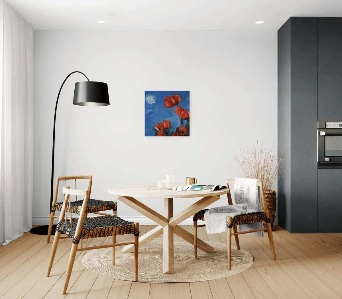 Dieses ausdrucksstarke Acrylbild, gemalt von einer Schweizer Künstlerin, zeigt prächtige Mohnblumen in kräftigen Rot- und Orangetönen auf einem strukturierten blauen Hintergrund. Die leuchtenden Blüten bilden einen wunderschönen Kontrast zum tiefen Blau und schaffen eine faszinierende Farbharmonie, die an helle Mondnächte erinnert. Die expressive Malweise mit sichtbaren Pinselstrichen und die strukturierte Oberfläche verleihen dem Werk eine besondere Lebendigkeit und Tiefe. Die kräftige Farbgebung und die dynamische Komposition ziehen den Blick sofort an und bringen Energie und Wärme in jeden Raum. Die Mohnblumen mit ihren charakteristischen Formen und die warmen Rottöne strahlen Lebensfreude und natürliche Schönheit aus. Der strukturierte blaue Hintergrund verstärkt die Leuchtkraft der Blüten zusätzlich. Ideal für Wohnzimmer, Schlafzimmer, Büro, Praxis oder als besonderes Geschenk für Blumen- und Kunstliebhaber. Einzigartiges, handgemachtes Kunstwerk aus der Schweiz.