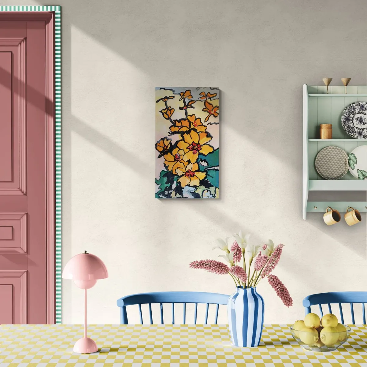 Dieses ausdrucksstarke Acrylbild, gemalt in der Schweiz, zeigt prächtige Blumen in leuchtenden Gelb- und Orangetönen mit zarten rosa Akzenten. Die markanten schwarzen Konturen betonen die organischen Formen der Blüten und verleihen dem Werk eine besondere Ausdruckskraft. Die harmonische Farbgebung mit pastellfarbenem Hintergrund und grünen Blättern strahlt Lebensfreude und tropische Eleganz aus. Die kraftvolle Pinselführung und der expressive Stil schaffen eine dynamische Komposition, die sofort ins Auge fällt. Die warmen Farbtöne bringen Wärme und positive Energie in jeden Raum. Ideal für Wohnzimmer, Büro, Praxis oder als besonderes Geschenk für Blumen- und Kunstliebhaber. Einzigartiges, handgemachtes Kunstwerk.