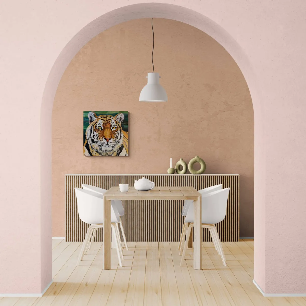 Dieses beeindruckende Acrylbild, gemalt von einer Schweizer Künstlerin, zeigt das kraftvolle Porträt eines Tigers mit durchdringendem Blick. Die intensiven bernsteinfarbenen Augen ziehen den Betrachter sofort in ihren Bann und verleihen dem Werk eine faszinierende Präsenz. Die meisterhafte Darstellung des Tigerfells mit seinen charakteristischen orange-schwarzen Streifen und den weissen Akzenten zeigt grosse künstlerische Detailgenauigkeit. Besonders beeindruckend sind die fein gemalten Schnurrhaare und die realistische Textur des Fells. Der grün-blaue Hintergrund mit seinen harmonischen Farbverläufen lässt den majestätischen Kopf des Tigers wirkungsvoll hervortreten. Die Kombination aus realistischer Darstellung und künstlerischer Interpretation schafft ein ausdrucksstarkes Werk voller Kraft und Eleganz. Das Bild strahlt die wilde Schönheit und Würde dieses faszinierenden Raubtieres aus. Ideal für Wohnzimmer, Büro, Praxis oder als besonderes Geschenk für Tier- und Kunstliebhaber. Einzigartiges, handgemachtes Kunstwerk aus der Schweiz.