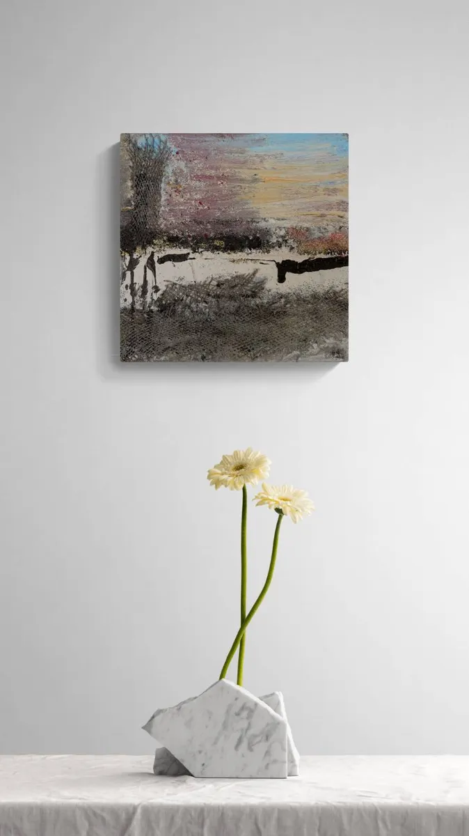 Dieses ausdrucksstarke abstrakte Acrylbild verbindet verschiedene Materialien und Strukturen zu einer faszinierenden Komposition. Die Künstlerin aus Luzern hat mit Acrylfarbe, Jute und diversen Strukturelementen eine vielschichtige Arbeit geschaffen, die an eine abstrakte Landschaft erinnert. Das Werk besticht durch seine reiche Textur und die harmonische Farbgebung in Pastelltönen. Zarte Rosa-, Blau-, Beige- und Orangetöne im oberen Bereich erinnern an einen atmosphärischen Himmel oder eine ferne Landschaft. Die dunklen, markanten horizontalen Elemente schaffen einen spannungsvollen Kontrast zur luftigen Farbgebung. Die eingearbeiteten Jute-Strukturen im unteren Bildbereich verleihen dem Werk eine besondere Haptik und Tiefe. Die verschiedenen Schichten und Materialien erzeugen eine dreidimensionale Wirkung, die das Bild je nach Lichteinfall unterschiedlich erscheinen lässt.