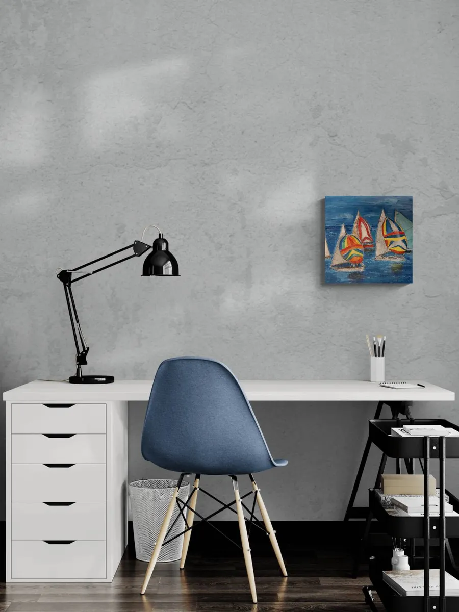 Regatta 2 auf hoher See mit farbenfrohen Segeln (Originalbild) Dieses charmante Acrylbild, gemalt von einer Schweizer Künstlerin, zeigt elegante Segelboote auf dem weiten Meer. Die farbenfrohen Segel in leuchtenden Farben setzen lebendige Akzente vor dem tiefblauen Wasser und dem blauen Himmel. Die maritime Szene strahlt Freiheit und Urlaubsstimmung aus. Die sichtbaren Pinselstriche verleihen dem Werk eine lebendige, impressionistische Note und fangen die Bewegung der Boote auf dem Wasser eindrucksvoll ein. Die harmonische Farbkomposition aus verschiedenen Blautönen, kombiniert mit den kontrastreichen Segeln, schafft eine beruhigende und gleichzeitig belebende Wirkung. Das Bild weckt Sehnsucht nach Meer, Wind und Weite. Ideal für Wohnzimmer, Ferienhaus, Büro oder als besonderes Geschenk für Segel- und Meerliebhaber. Einzigartiges, handgemachtes Kunstwerk aus der Schweiz