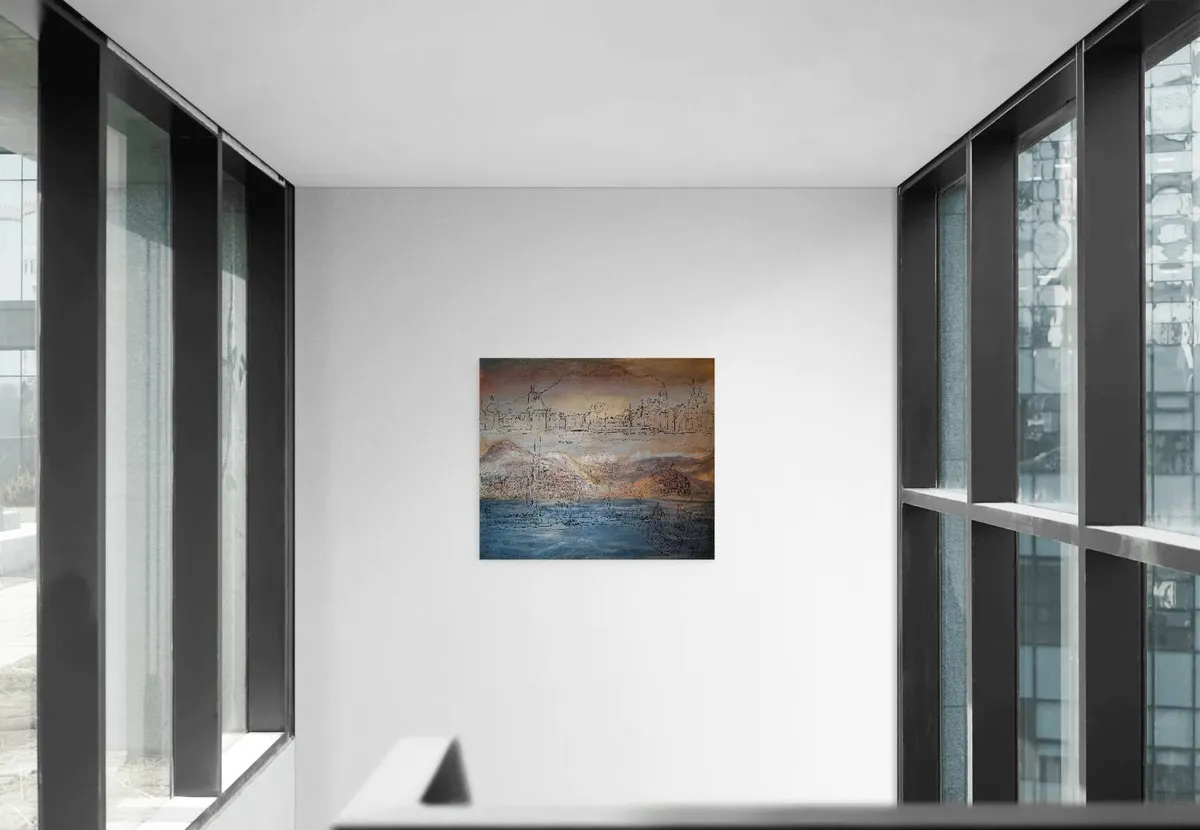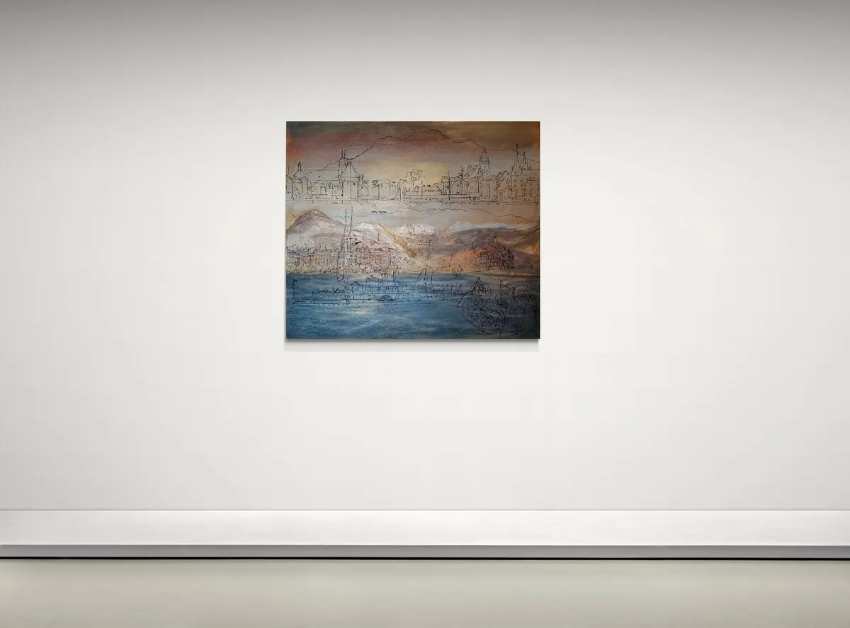 Luzerner Stadtlandschaft in mehrschichtiger Perspektive Dieses grossformatige Acrylgemälde (120 x 140 cm, 4 cm Tiefe) präsentiert eine eindrucksvolle Collage charakteristischer Luzerner Motive. Die Komposition vereint verschiedene Stadtansichten und Wahrzeichen in einer atmosphärischen Mehrschichtigkeit. Im oberen Bildbereich erscheint eine historische Stadtsilhouette mit markanten Kirchtürmen und Profanbauten, die sich vor einem imposanten Bergmassiv abzeichnet. Die Linienführung ist präzise und erinnert an technische Zeichnungen oder Radierungen. Der mittlere Bereich zeigt eine weitere Ansicht der Stadt am See, wobei die charakteristischen Türme und die alpine Kulisse das typische Stadtbild von Luzern widerspiegeln. Die Farbgebung wechselt von warmen Braun- und Ockertönen zu kühleren Grau- und Blaunuancen. Im unteren Drittel dominiert eine Szene mit einem historischen Dampfschiff auf dem Vierwaldstättersee. Die Wasseroberfläche ist in intensivem Blau gehalten und bildet einen starken Kontrast zu den erdigen Tönen der Stadtansichten. Rechts unten findet sich eine figurative Darstellung, möglicherweise mythologische oder historische Gestalten.
