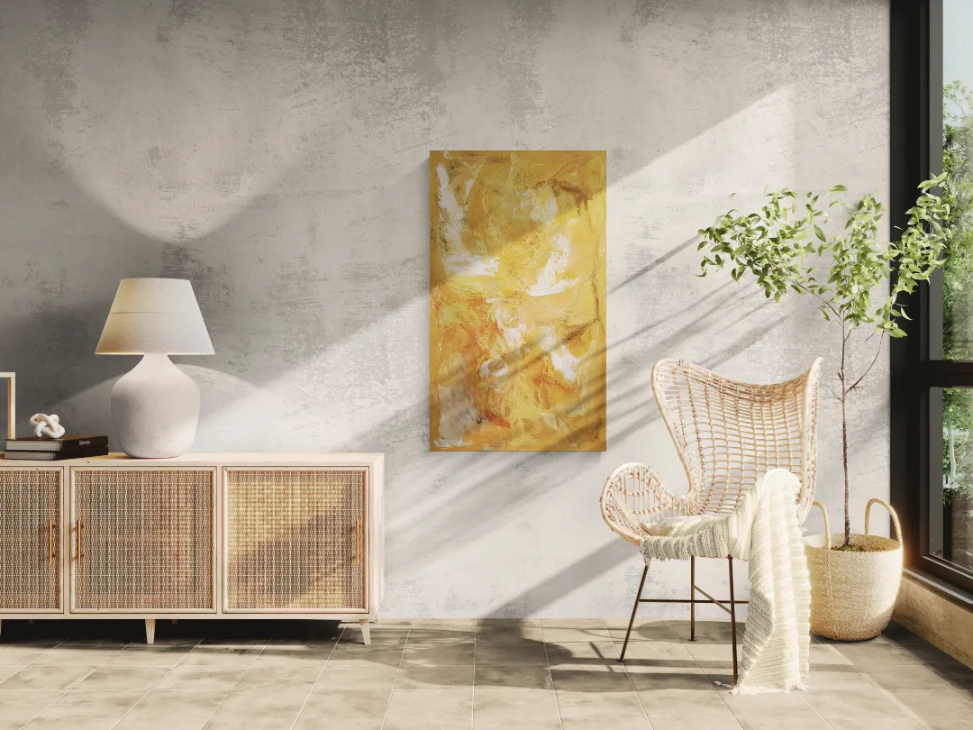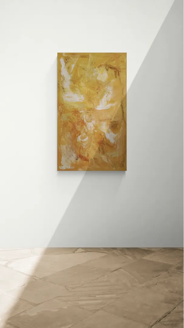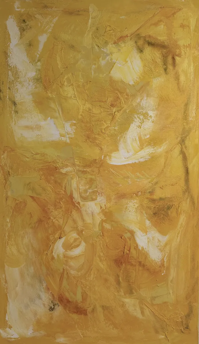 Dieses eindrucksvolle abstrakte Gemälde besticht durch seine warme Farbgebung in Gold, Ocker und Beigetönen. Das Werk ist in Mischtechnik mit Acrylfarben auf Leinwand gemalt und zeigt eine ausdrucksstarke Struktur mit verschiedenen Schichtungen. Die dynamischen Pinselstriche und die reliefartigen Texturen verleihen dem Bild eine besondere Tiefe und Lebendigkeit.