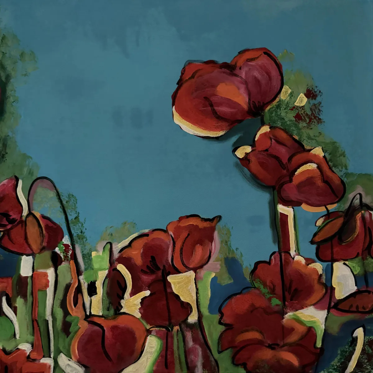 (23.62 x 23.62 in)Mohnblumen Gemälde in Acryl, 60 x 60 cm. Das Kunstwerk zeigt leuchtend rote und bordeauxfarbene Mohnblüten vor türkisblauem Sommerhimmel, gemalt in expressiver Mischtechnik auf Leinwand mit Keilrahmen. Die kräftige Farbgebung mit intensiven Rottönen, cremeweissen Akzenten und satten Grüntönen erzeugt eine lebendige Blumenwiese. Schwarze Konturlinien betonen die grafische Qualität der Blüten, während der pastose Farbauftrag dem Werk haptische Lebendigkeit verleiht. Die Komposition verbindet naturalistische Blumendarstellung mit expressiver Malweise und schafft eine sommerliche, heitere Atmosphäre. Ideal für Liebhaber botanischer Kunst, Landschaftsmalerei und farbintensiver zeitgenössischer Kunst im quadratischen Format.