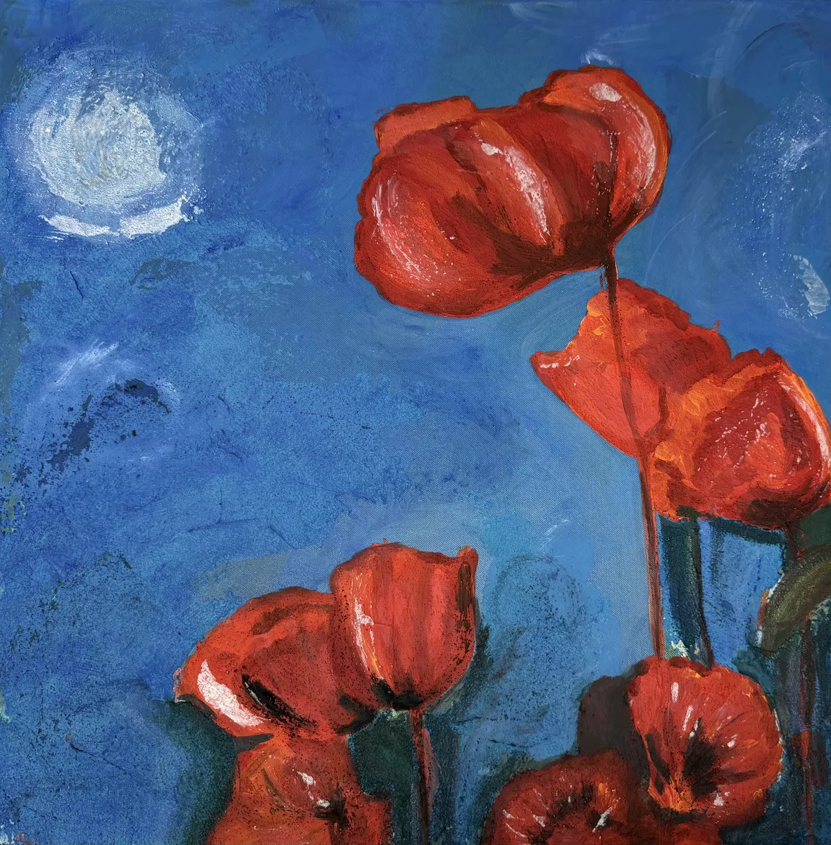 ErstellungsdatumDieses ausdrucksstarke Acrylbild, gemalt von einer Schweizer Künstlerin, zeigt prächtige Mohnblumen in kräftigen Rot- und Orangetönen auf einem strukturierten blauen Hintergrund. Die leuchtenden Blüten bilden einen wunderschönen Kontrast zum tiefen Blau und schaffen eine faszinierende Farbharmonie, die an helle Mondnächte erinnert. Die expressive Malweise mit sichtbaren Pinselstrichen und die strukturierte Oberfläche verleihen dem Werk eine besondere Lebendigkeit und Tiefe. Die kräftige Farbgebung und die dynamische Komposition ziehen den Blick sofort an und bringen Energie und Wärme in jeden Raum. Die Mohnblumen mit ihren charakteristischen Formen und die warmen Rottöne strahlen Lebensfreude und natürliche Schönheit aus. Der strukturierte blaue Hintergrund verstärkt die Leuchtkraft der Blüten zusätzlich. Ideal für Wohnzimmer, Schlafzimmer, Büro, Praxis oder als besonderes Geschenk für Blumen- und Kunstliebhaber. Einzigartiges, handgemachtes Kunstwerk aus der Schweiz.