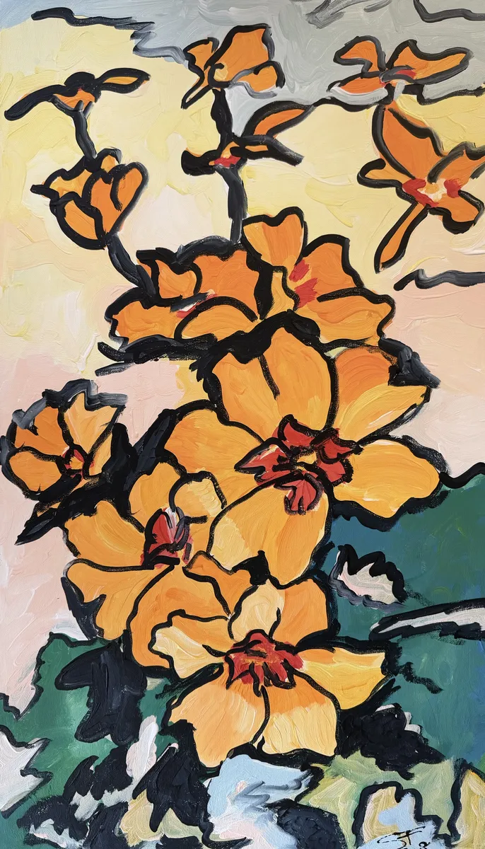 ErstellungsdatumDieses ausdrucksstarke Acrylbild, gemalt in der Schweiz, zeigt prächtige Blumen in leuchtenden Gelb- und Orangetönen mit zarten rosa Akzenten. Die markanten schwarzen Konturen betonen die organischen Formen der Blüten und verleihen dem Werk eine besondere Ausdruckskraft. Die harmonische Farbgebung mit pastellfarbenem Hintergrund und grünen Blättern strahlt Lebensfreude und tropische Eleganz aus. Die kraftvolle Pinselführung und der expressive Stil schaffen eine dynamische Komposition, die sofort ins Auge fällt. Die warmen Farbtöne bringen Wärme und positive Energie in jeden Raum. Ideal für Wohnzimmer, Büro, Praxis oder als besonderes Geschenk für Blumen- und Kunstliebhaber. Einzigartiges, handgemachtes Kunstwerk.